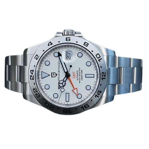 This Pagani Design GMT wristwatch is designed for functionality and personal styling. Featuring a durable stainless steel bracelet and a clear white dial, this automatic watch includes a date display and a 24-hour bezel. Suitable for everyday wear, it offers a classic aesthetic with a reliable mechanical movement.